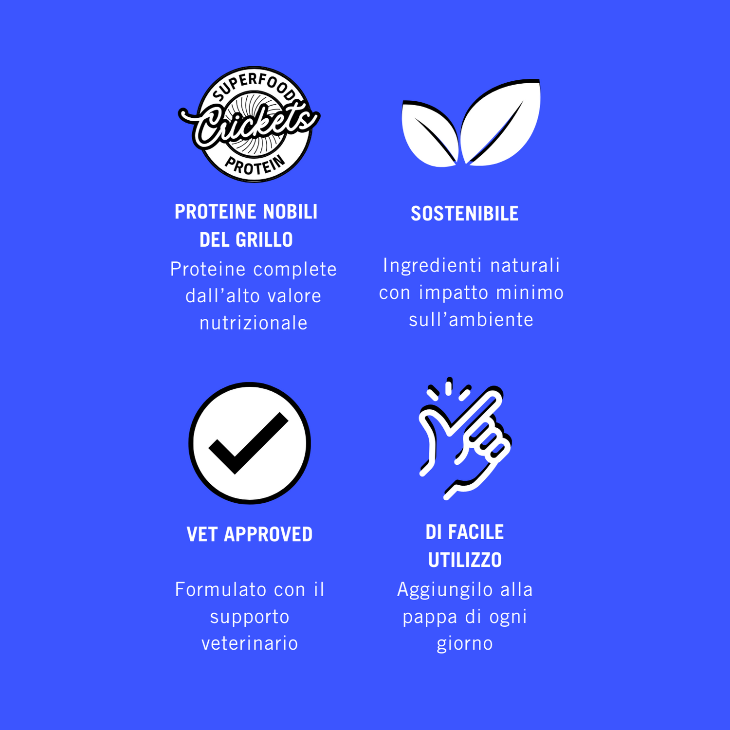 BOWLMATES aggiunge alla sua pappa (qualunque pappa!) GUSTO, rendendola più buona e appetibile, e NUTRIENTI attraverso le proteine nobili del grillo e pochi altri ingredienti naturali e sostenibili.